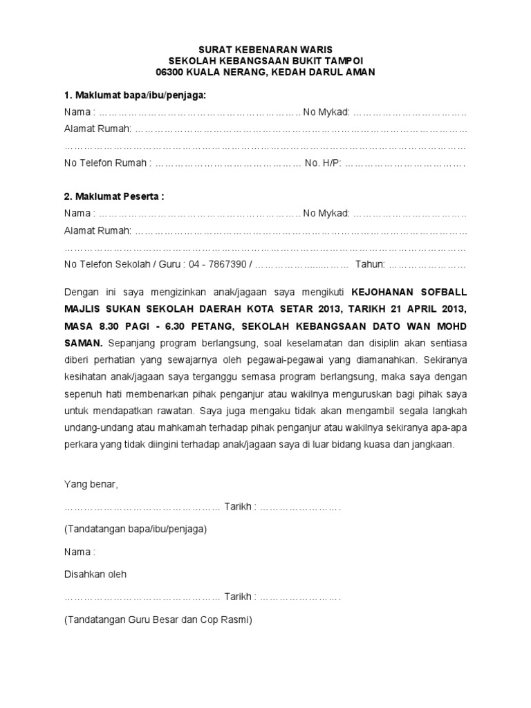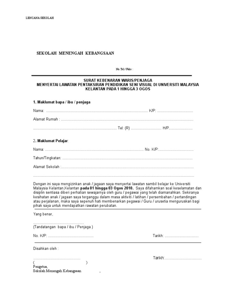 Surat Akuan Kebenaran Waris Menyertai Aktiviti Lawatan Pdf